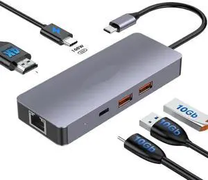 FORIDA 6IN1 USB C Hub to HDMI 4K60Hz Ethernet RJ45 Port PD 100W USB 3.2 Type C 10Gbps Adapter Compatible with Laptop Models Notebook Models