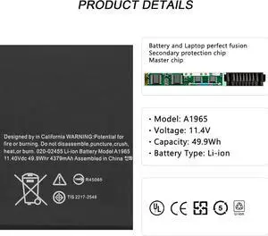 A1932 A2179 A1965 Laptop Battery for MacBook Air 13 inch Retina A1932 (2018 2019) A2179 (Early 2020), EMC 3184 3302 MRE82LL MREA2LL MREF2LL MRE92LL MUQT2LL MVFH2LL MVFM2LL 11.4V 49.9Wh 4379mAh