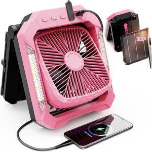 26800mAh Portable Fan Rechargeable with 18W Detachable Solar Panel, Quiet Battery Powered Camping Fan Cordless with LED Lantern,3 Speed,Timer,USB-C,for Bedroom Tent Home Office Desk Hurricane(Pink)