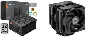 PCCOOLER CPS YS1000 Fully Modular Power Supply, 80 PLUS Gold 1000W PSU, 12V-2x6 Cable, ATX 3.1 & PCIe 5.1 Ready, 105°C Rated Japanese Capacitors, ECO Mode, 135mm FDB Fan, 12 Years Warranty and PCCOOLER CPS RT620Pro Digital Dual Tower CPU Air Cooler, 6 Heat Pipes, 265W TDP, Digital Display Top Cover, 157mm Tall, Reinforced Structure, for Intel LGA1851/1700/1200/115X & AMD AM5/AM4, Black