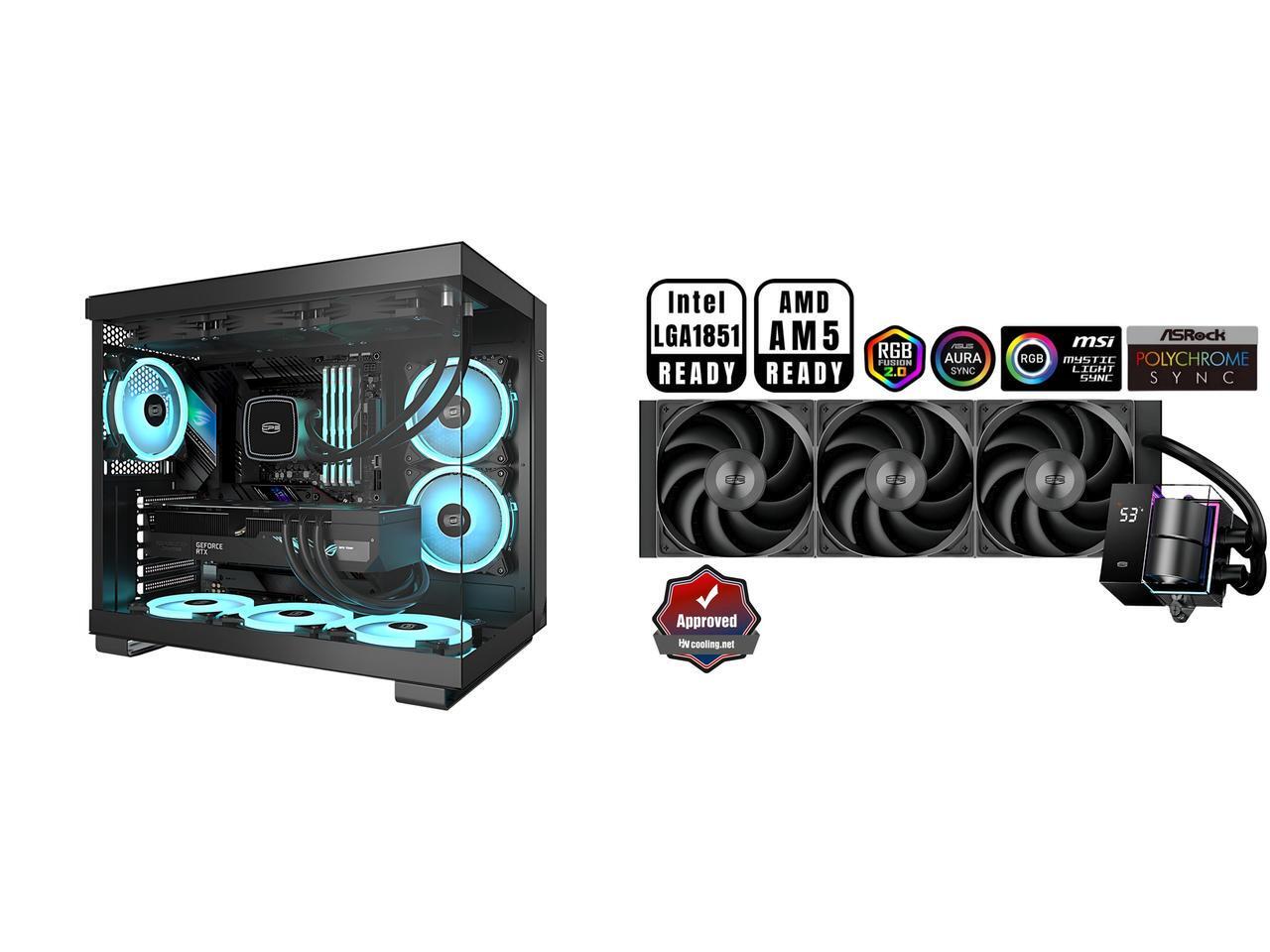 PCCOOLER CPS C3 T500 ARGB PC Case, Dual-Chamber Mid-Tower ATX Case, Desktop Computer Case w/ 6 ARGB Fans Pre-installed w/ Fan Hub, Column-Free Design, Tempered Glass, USB 3.1 Gen 2 Type-C, Black and 1 x PCCOOLER CPS DS360 AIO CPU Liquid Cooler, 360mm Radiator, 310W TDP, Dual Chamber Pump, ARGB LEDs & Digital Display, Aluminum Pump Cover, for Intel LGA 1851/1700/1200/115X & AMD AM5/AM4, Black