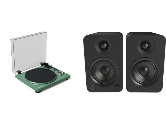 Kanto OBI3 Belt Drive Turntable w/Bluetooth 5.3 & Preamp | Pitch Control | AT3600L Cartridge | Aluminum Platter | Matte Green and 1 x Kanto YU4 Powered Bookshelf Speakers with Built-In Bluetooth - Pair (Matte Black)