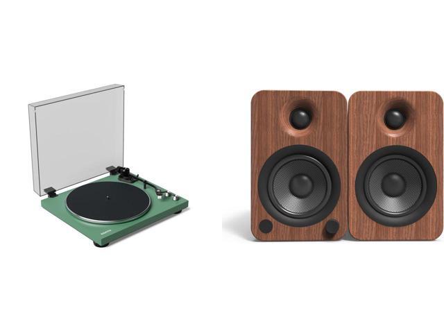Kanto OBI3 Belt Drive Turntable w/Bluetooth 5.3 & Preamp | Pitch Control | AT3600L Cartridge | Aluminum Platter | Matte Green and 1 x Kanto YU4 Powered Bookshelf Speakers with Built-In Bluetooth, 1" Silk Dome Tweeter and 4" Kevlar Woofer - Pair (Walnut)