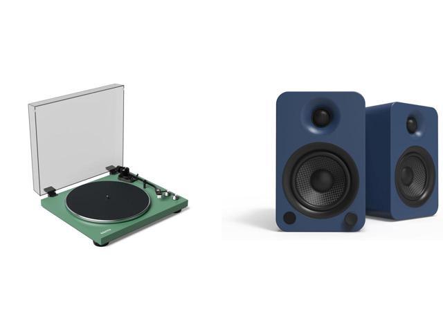 Kanto OBI3 Belt Drive Turntable w/Bluetooth 5.3 & Preamp | Pitch Control | AT3600L Cartridge | Aluminum Platter | Matte Green and 1 x Kanto YU4MU Powered Speakers with Bluetooth and Built-in Phono Preamp | 140W Peak Power | 1" Silk Dome Tweeter and 4" Kevlar Driver | Auto Standby and Startup | Remote Included | Pair | Matte Blue