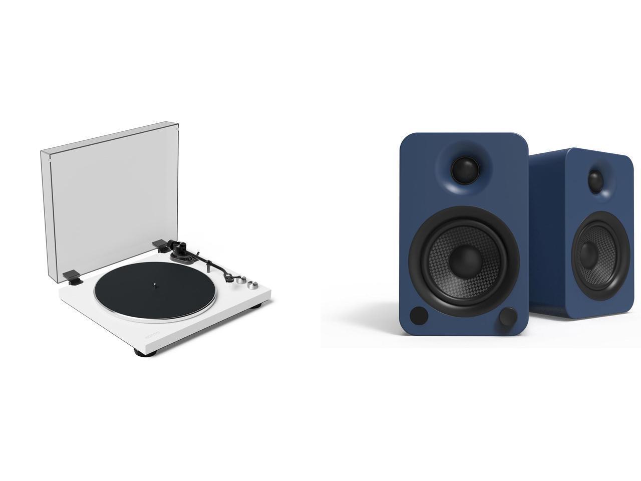 Kanto OBI3 Belt Drive Turntable w/Bluetooth 5.3 & Preamp | Pitch Control | AT3600L Cartridge | Aluminum Platter | Matte White and 1 x Kanto YU4MU Powered Speakers with Bluetooth and Built-in Phono Preamp | 140W Peak Power | 1" Silk Dome Tweeter and 4" Kevlar Driver | Auto Standby and Startup | Remote Included | Pair | Matte Blue
