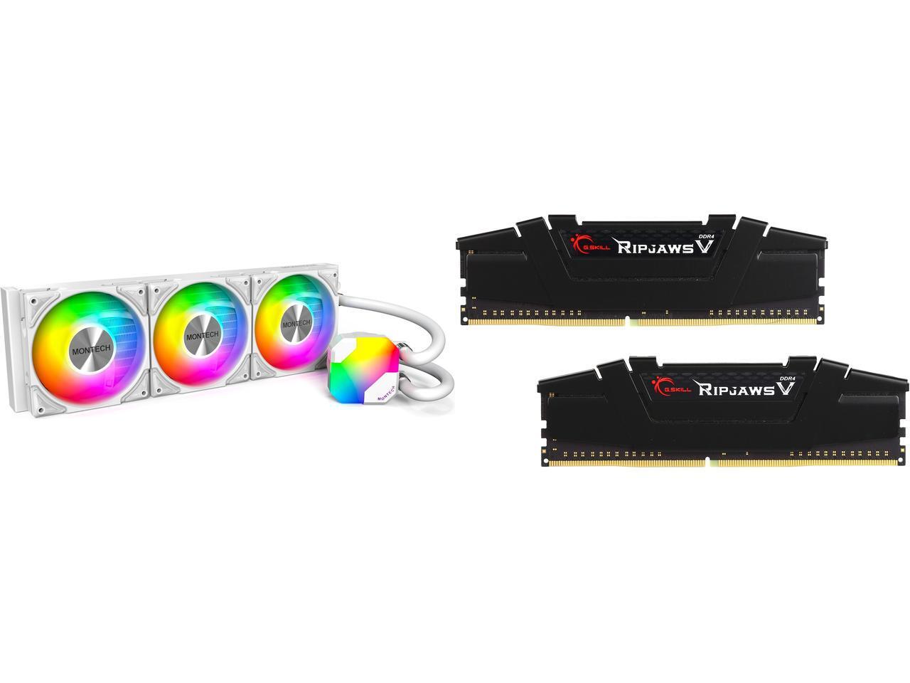 MONTECH HyperFlow ARGB 360 - AIO CPU Liquid Cooler, Intel&AMD Compatible, Chart-Topping Performance, Enhanced 3100RPM Water Pump Design, 3X Metal Pro 12 ARGB Ultimate Cooling Fans - White G.SKILL Ripjaws V Series 32GB (2 x 16GB) 288-Pin PC