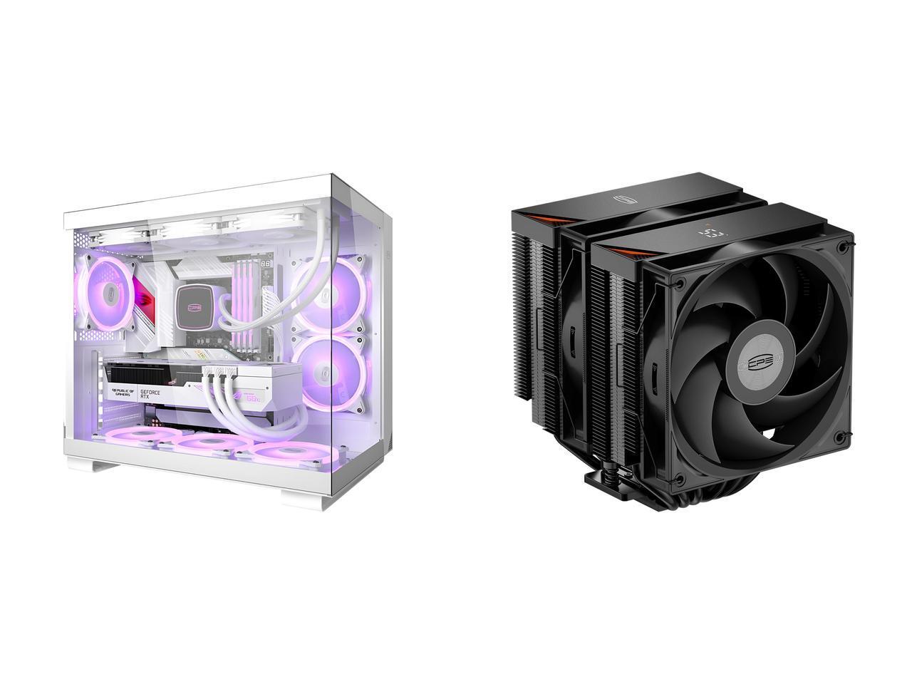 PCCOOLER CPS C3 T500 ARGB PC Case, Dual-Chamber Mid-Tower ATX Case, Desktop Computer Case w/ 6 ARGB Fans Pre-installed w/ Fan Hub, Column-Free Design, Tempered Glass, USB 3.1 Gen 2 Type-C, White and 1 x PCCOOLER CPS RT620Pro Digital Dual Tower CPU Air Cooler, 6 Heat Pipes, 265W TDP, Digital Display Top Cover, 157mm Tall, Reinforced Structure, for Intel LGA1851/1700/1200/115X & AMD AM5/AM4, Black