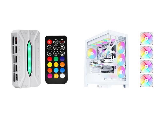 SAMA 20-Port Case Fan Hub with Remote, SATA Power 10-Port 4-Pin PWM Fan Speed and 10-Port 3-Pin ARGB Lighting Controller and 1 x SAMA V50 White Mid Tower PC Case, 4x120mm ARGB PWM Fan Pre-Install for Efficient Cooling, Compatible ATX/MATX/ITX Motherboards and Back-Connect Design Supports 360mm Water Cooling and 40 Series GPU