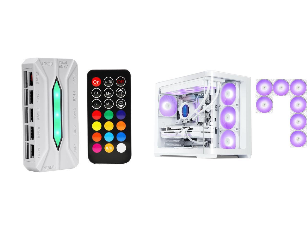 SAMA 20-Port Case Fan Hub with Remote, SATA Power 10-Port 4-Pin PWM Fan Speed and 10-Port 3-Pin ARGB Lighting Controller and 1 x SAMA V60 PC Case, Mid-Tower Computer Case, A Curved Tempered Glass, 7 Pre-Installed ARGB PWM Fans and Fan Hub, USB Type-C, ATX/MATX/ITX Back-Connect Support, 360mm Liquid Cooler Compatible, White
