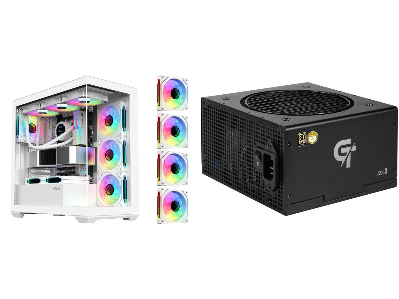SAMA SV01 Gaming PC Case Computer Mid Tower ATX Case White with 4 Addressable RGB Fans Pre-Installed, Back Plug Motherboard Design, Tempered Glass Transparent Side Panel and 1 x SAMA GT650BK Black 80 PLUS Gold Fully Modular ATX Power Supply - ATX 3.1 & PCIe 5.1 Compliant - Japanese Capacitors - FDB Fan with Auto Speed Control - 5 Year Warranty