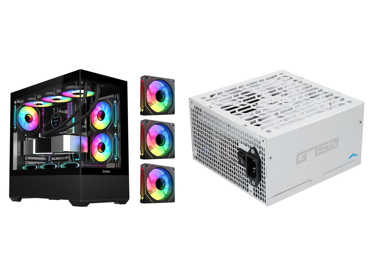 SAMA SV02 ATX Computer Gaming PC Case Mid Tower Black with 3 ARGB Fans Pre-Installed, Tempered Glass Transparent Side Panel,BTF Back Plug Motherboard Design and 1 x SAMA G750W ATX 3.1 Power Supply, 750W, Cybenetics Gold Standards, PCIe 5.1 Ready, Full Modular, Japanese Capacitors, FDB Fan, White Version