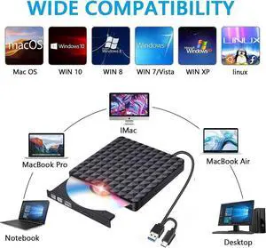 External CD DVD Drive, Portable High-Speed USB-C & USB 3.0 CD/DVD ROM DVD Burner/DVD Reader Writer Optical Drive for PC Desktops, Compatible with Windows/Mac OS X/Linux
