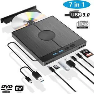 [7 in 1] External CD DVD Drive, USB 3.0 Type-C External CD/DVD DVD Burner Slim Optical Drive DVD Burner with SD/TF Card Slot 2 USB 3.0 Ports 2 Type-C Ports for Laptop PC Windows Linux MacOS