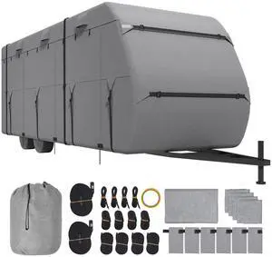 Travel Trailer Cover, 20-22 ft RV Cover, 4-Layer Non-Woven Fabric Camper Cover, Waterproof, Windproof and Rip-Stop Class A RV Cover, with Storage Bag, Repair Patches, Straps and Tire Covers