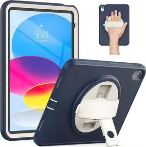 iPad 10th Generation Case 10.9 Inch 2022 (Model: A2696/ A2757/ A2777), Sturdy Shockproof Protective Case with 360° Rotating Stand, Hand Strap and Pencil Holder, Navy Blue