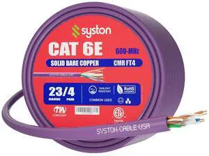 SYSTON CAT 6E Ethernet Network Lan Cable Bulk Raw - 600 MHz 23 AWG UTP Solid Bare Copper Wire For Indoor/Outdoor IP PoE Applications, FT4/CMR/Riser-Rated ETL Listed RoHS Without RJ45 End - Purple, 30m