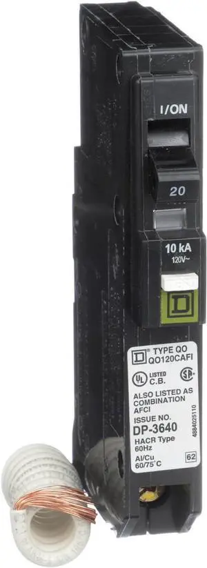 Schneider Electric - Square D Mini Circuit Breaker, QO, Pressure Plate Connection, 20A, 1 Pole, 120VAC, 10kA, Plug-in, Combo ARC Fault, Pigtail, Black, QO120CAFI