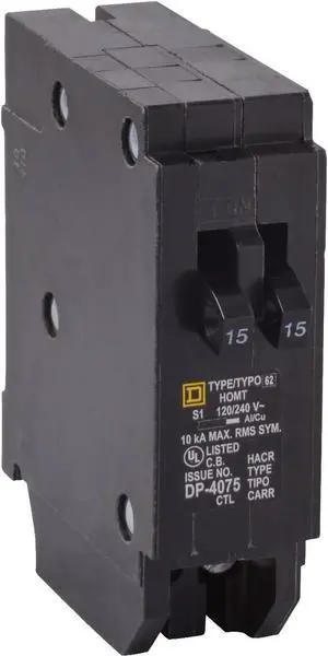 Schneider Electric - Homeline Tandem Circuit Breaker, 2 x 1 Pole at 15A, 120/240Vac, 10kA Air, Plug-in, Ul Hacr Rated Breaker Application, Screw Clamp