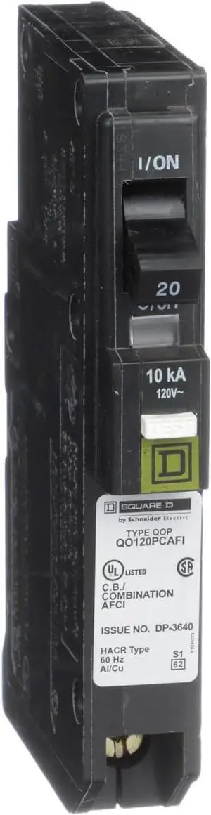 Schneider Electric - Square D Miniature Circuit Breaker, QO, 20A, 1 Pole, 120/240VAC, 10kA, Plug in, Combo ARC Fault, Plug On Neutral, HACR Rated Breaker Application, CSA Standard Certified