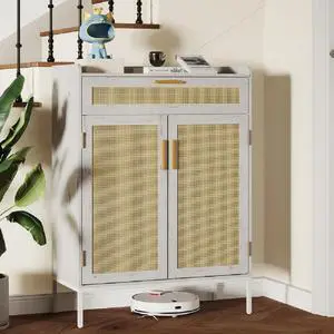 Toytexx Inc Rattan Door Storage Cabinet: Shoe Rack Organizer with Top Drawer & Adjustable Shelves (White)