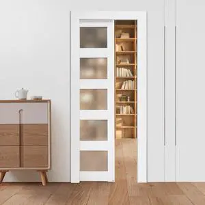 VEVOR Sliding Pocket Door, 36" x 80", 5-Lite Frosted Glass Single Sliding Door with Hardware Kit, Sturdy Solid Wood & MDF Pocket Doors Slab with Waterproof Surface for Bedroom Kitchen Study Room