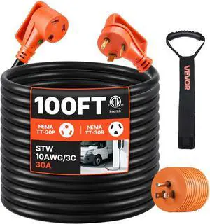 VEVOR 100 FT RV Extension Cord, 30 Amp, 125V 2500W Heavy Duty STW 10/3 Gauge Wire, NEMA TT-30P Male NEMA TT-30R Female Plug, with LED Power Indicator, Handle, 15A Adapter, for RV Trailer, ETL Listed