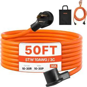 VEVOR 50 ft Dryer Extension Cord, 3-Prong NEMA 10-30P to 10-30R Dryer Cord, 125V/250V STW 10AWG/3C, 30A, Pure Copper Wire Cable with Black Non-Woven Bag and PVC Cable Tie, Ideal for Indoor & Outdoor