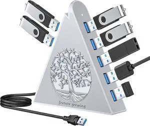 JoyReken 7-Port USB 3.0 Hub, Silver Vertical USB Expander with Tree-Themed RGB Lighting, 5Gbps Transfer Speed, 2FT Extension Cable, for MacBook, Laptop, Desktop, Xbox, Flash Drive, Printer