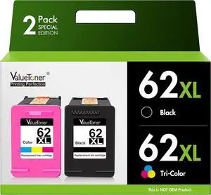 Valuetoner Remanufactured Ink Cartridge Replacement for HP Ink 62 62XL Works with HP Envy 5540 5640 5660 7644 OfficeJet 5740 5741 8040 OfficeJet 200 250 Series Printer (2-Pack, 1 Black 1 Tri-Color)