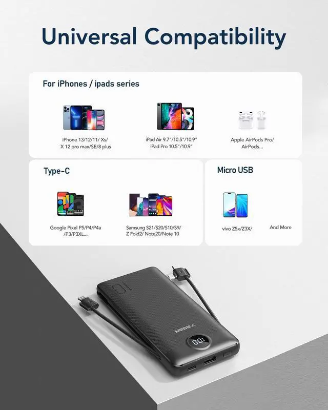 • [Wide Compatibility]VEGER portable battery charger is widely compatible with All iPhone, iPad, Samsung, Google Pixel, tablets, just connected to your device with the cable built in and the external battery would fix with different devices to get fastest charging.