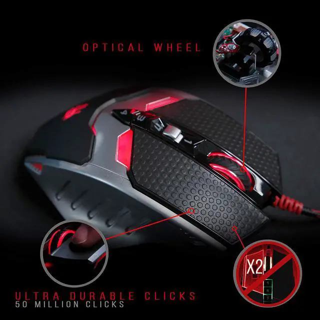 Metal X'Glide Armor Boot Armor Boot eliminate friction on nearly any surface for smoother motions, precise cursor movements and improved accuracy. 4 Shooting Modes in Left Button Use "1, N, 3, 4" keys to shift 4 shooting modes and boost up firepower instantly. No Double-Click | Optical Mouse Wheel The output is zero-bouncing, improves metal switch double-click issue. Gaming Precision (8200 CPI) Adjustable resolution 800/1000/1200/1600/8200 CPI Max.
