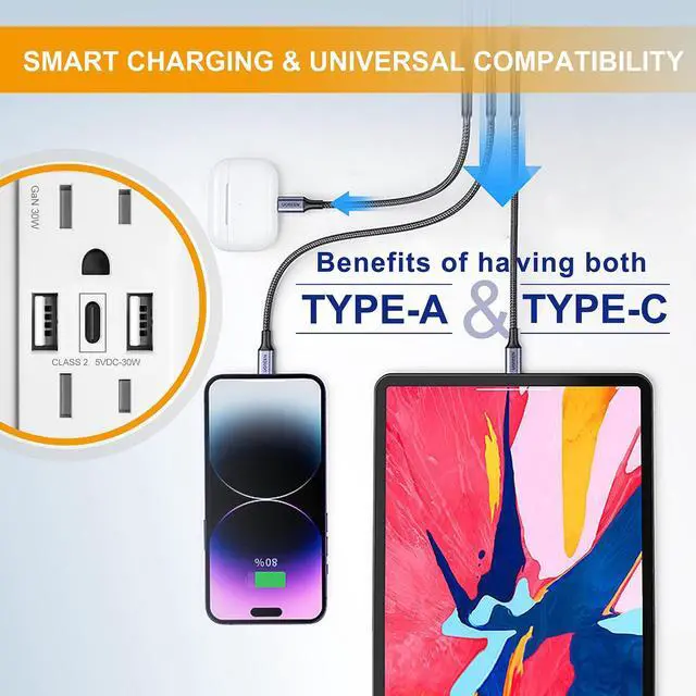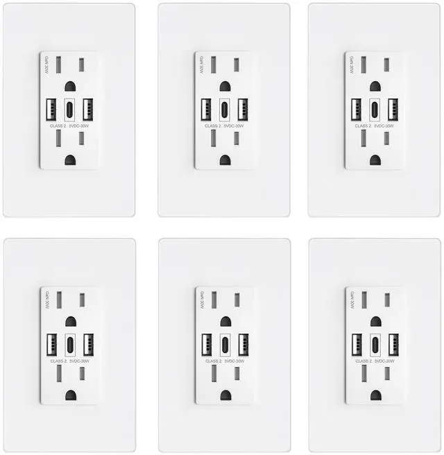 ABBOTECH USB Wall Outlet, 30W GaN 6.0A USB Outlet Receptacles with 3 USB Ports,15 Amp Tamper-Resistant Electrical Outlet with 2 Type A&1 Type C,Screwless Wall Plate Included,UL Listed,6 Pack