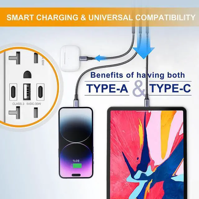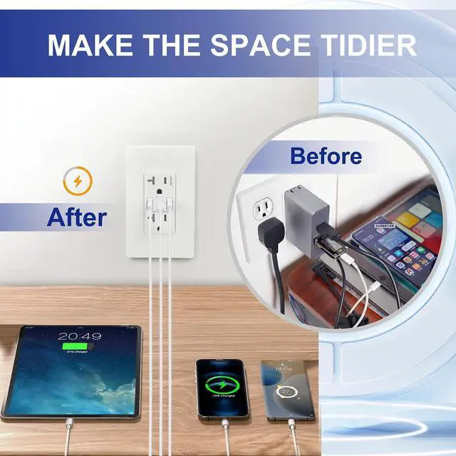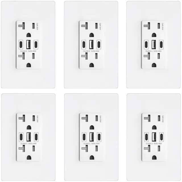 ABBOTECH USB Wall Outlet, 30W GaN 6.0A USB Outlet Receptacles with 3 USB Ports,20 Amp Tamper-Resistant Electrical Outlet with 1 Type A&2 Type C,Screwless Wall Plate Included,UL Listed,6 Pack