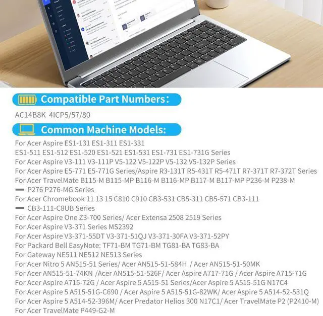 Compatible Laptop Model: For Acer Aspire ES1-131 ES1-311 ES1-331 ES1-511 ES1-512 ES1-520 ES1-521 ES1-531 ES1-731 ES1-731G Series For Acer Aspire V3-111 V3-111P V5-122 V5-122P V5-132 V5-132P Series For Acer Aspire E5-771 E5-771G Series For Acer Aspire R3-131T R5-431T R5-471T R7-371T R7-372T Series For Acer TravelMate B115-M B115-MP B116-M B116-MP B117-M B117-MP P236-M P238-M P276 P276-MG Series For Acer Chromebook 11 13 15 C810 C910 CB3-531 CB5-311 CB5-571 CB3-111 CB3-111-C8UB Series For Acer Aspire One Z3-700 Series For Acer Extensa 2508 2519 Series For Acer Aspire V3-371 Series MS2392 For Acer Aspire V3-371-55DT V3-371-51QJ V3-371-30FA V3-371-52PY For Packard