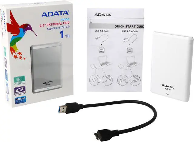 ADATA 1TB HV100 Portable External Hard Drive USB 3.0 Model AHV100-1TU3-CWH White