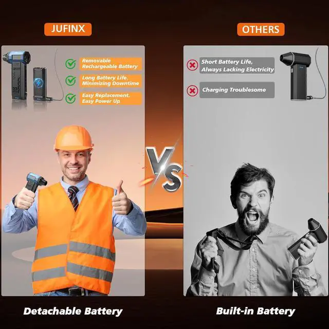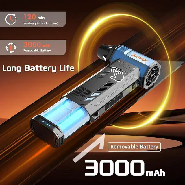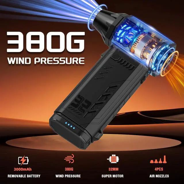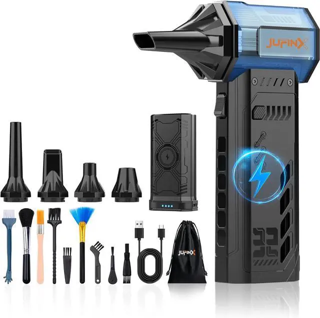 Turbo Motor Electric Air DusterJUFINX compressed air duster use a 32MM newest super powerful brushless motor technology and super-strong blowing force. Delivering 380G wind pressure with a maximum wind speed of 70 m/s. This high-speed airflow quickly and efficiently clears dust dirt and debris from keyboards electronics snow and hard-to-reach areas. It is a perfect choice for dust cleaning at home office outdoor and automobiles. Removable Battery and Long Battery LifeThis electric compressed air duster feature a specially customized 3000mAh removable battery which is a new breakthrough in air duster file only our JUFINX have this technology now.