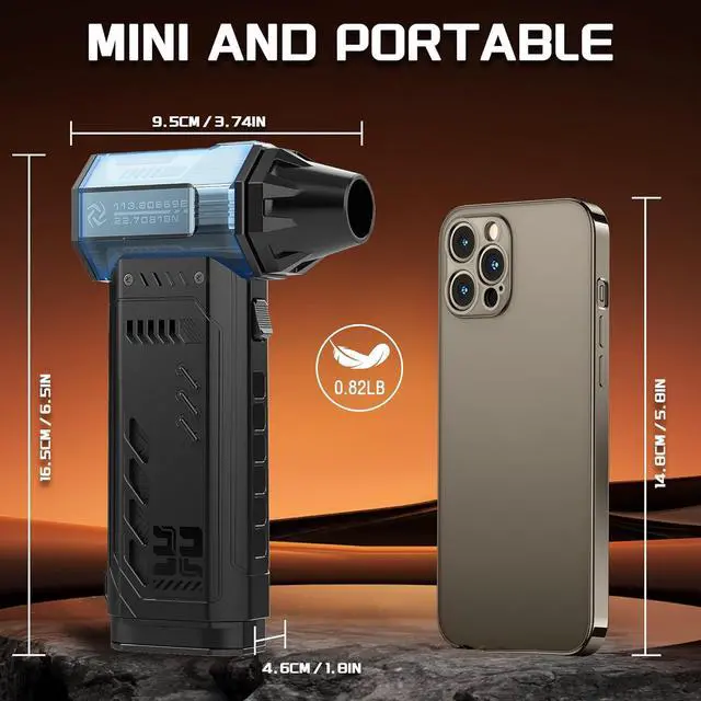 Portable and VersatileTurbo fan designed with a mini size ( 16.5 x 9.5 x 4.6 cm/ 6.5 x 3.74 x 1.8 inch) 373g/ 13.16 oz lightweight and easy to carry providing a comfortable grip with a non-slip silicone handle. Its portable design ensures you can keep it handy in toolboxes car compartments or desk drawers for on-the-go cleaning. Wide Range of UsesDust cleaner is versatile for numerous daily applications such as cleaning keyboards computer towers air conditioning vents car window slats rearview mirrors sofa crumbs drying pet hair fueling barbecues inflating items blowing snow and even cooling as a fan.