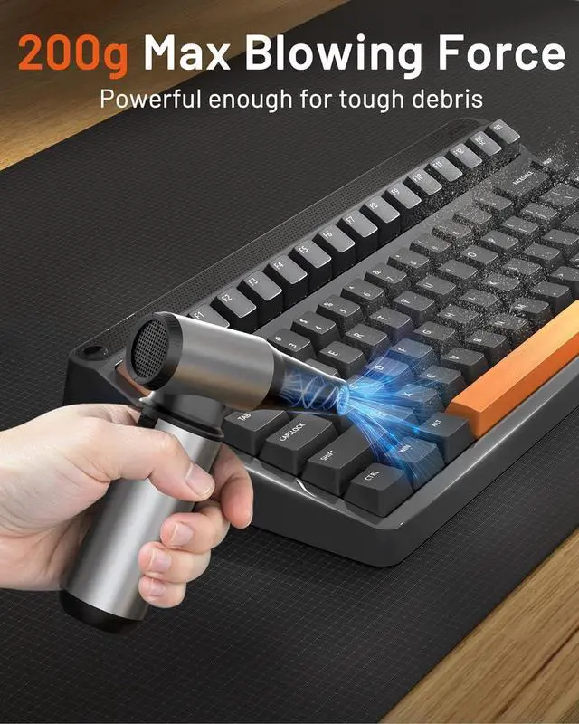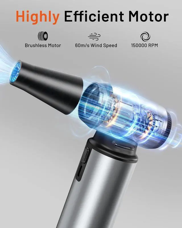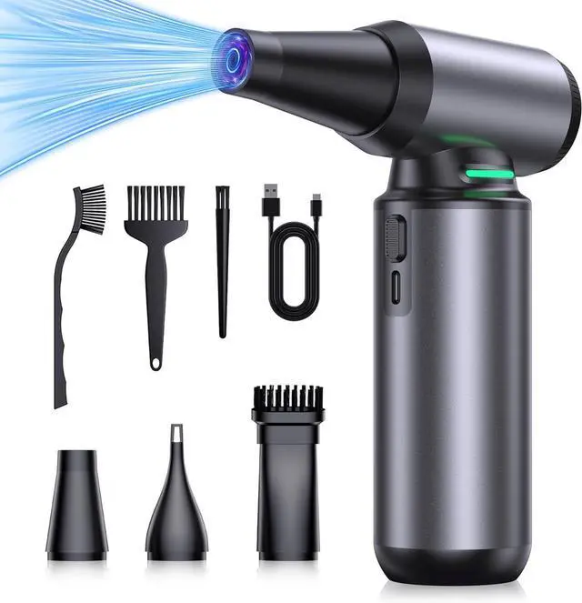 Powerful Air DusterThe OFISPEED air duster is equipped with a 150 000 RPM brushless motor delivering strong high-speed airflow that penetrates mechanical keyboard gaps and easily blows away dust from car interiors. More powerful efficient than canned air! Multiple UsesWith 3 nozzles and 3 brushes included this compressed air duster is perfect for cleaning PCs keyboards PS5 consoles as well as for home car and outdoor use. It also doubles as an inflator for swimming ring and other inflatables. One tool endless possibilities! Reusable & Cost-EffectiveMade of durable alloy and ABS materials this compressed air features long-lasting batteries and fast Type-C charging.