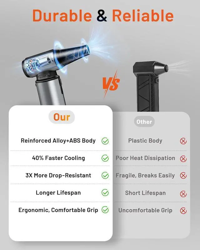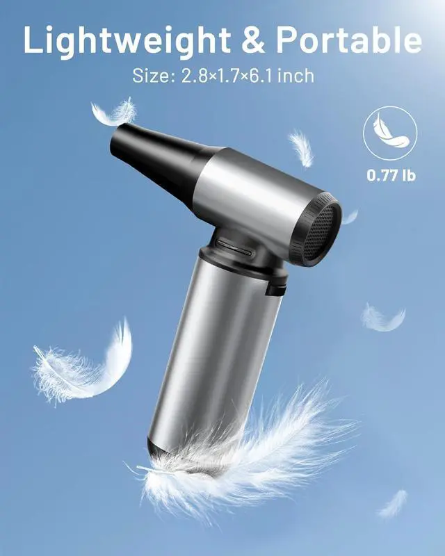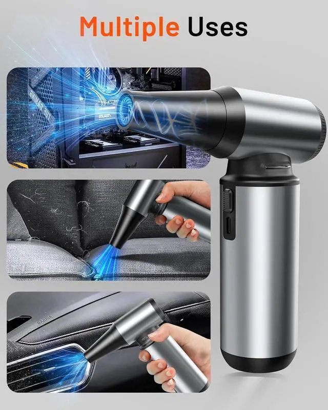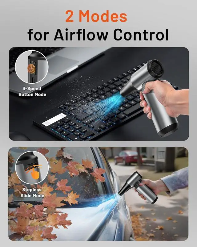 Unlike single-use compressed air cans it's a reusable and eco-friendly choice that saves money while reducing waste. Advanced Speed Control the electric air duster Features both 3-speed button mode and stepless sliding mode for precise airflow control. Also the special indicator light lets you effortlessly track speed levels and battery life. Simply press and hold the button for instant shutdown ensuring a hassle-free user experience. Enjoy efficient cleaning anytime anywhere! Package List this electric duster