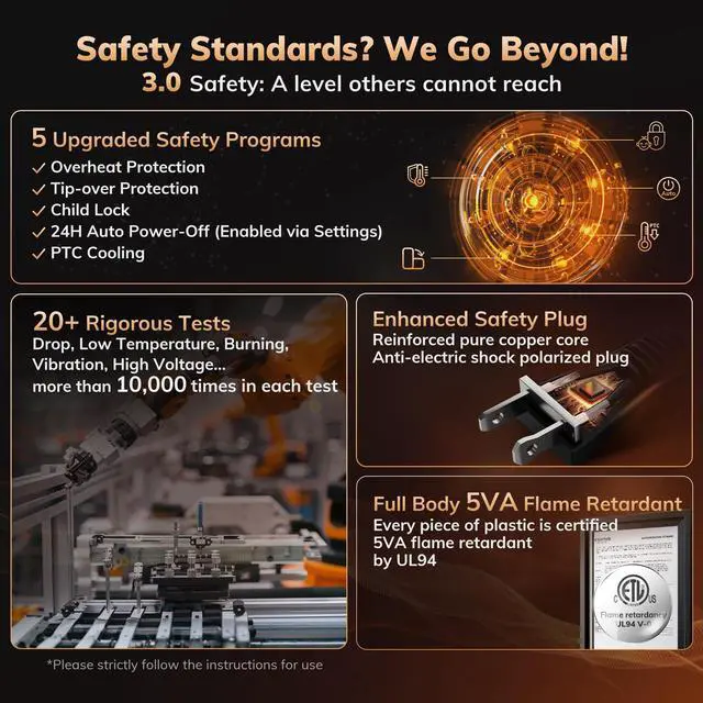 ETL-Certified Safety: Made of V0 flame-retardant materials with multiple safety features including built-in smart tip-over protection, overheat protection, 24-hour off timer, 24-hour automatic power off without interaction, V0 flame retardant 2-prong plug, and sturdy 6ft long flat power cord. Safe and worry-free all-day use. Safety Reminder: Please do not use with an extension cord. Only plug directly into the wall outlet.
