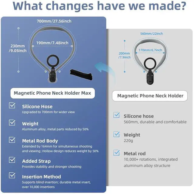 Quick Installation - Max neck phone stand adopts 16 pieces of strong aluminum magnets, ipho*e 12-15 series can be directly adsorbed, adsorption weight up to 3KG. If with a thin phone case on the adsorption weight can still be retained 2.5kg. Integrated zinc alloy rod lift structure, fast and easy to install, achieve the first perspective shooting, say goodbye to the tedious disassembly process of cell phone bracket