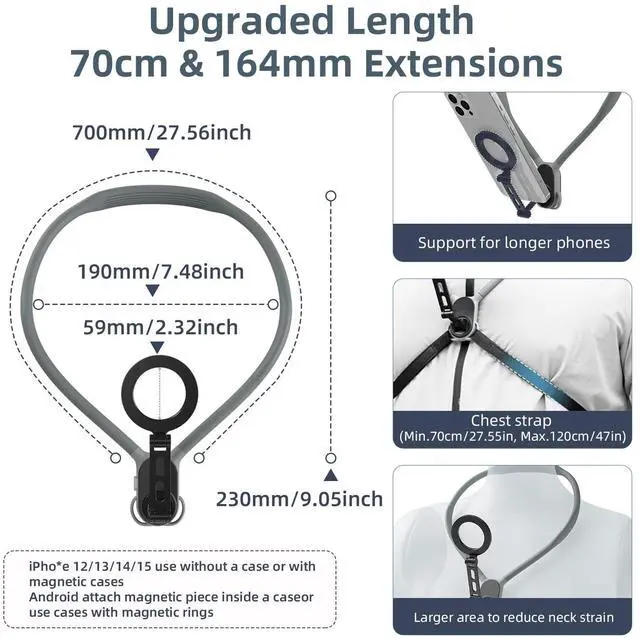 70cm/27.55in Max Phone Neck Holder - Upgraded large size neck mount phone holder, 70cm length is approximately equal to the circumference of a size 5 basketball, and can be comfortably worn by anyone from 60-120kg. Larger contact area to reduce the pressure on your neck