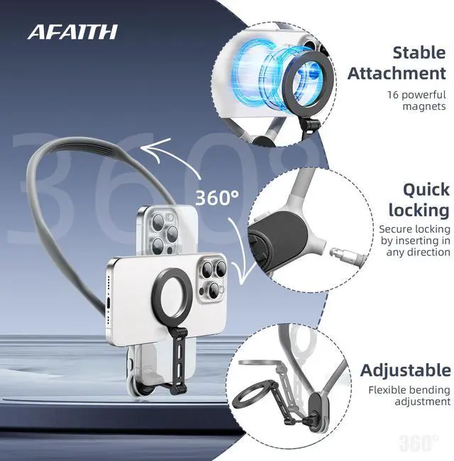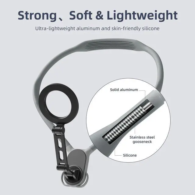 Soft and Strong- AFAITH phone neck holder is made of a three-layer structure: an inner stainless steel gooseneck, a sturdy aluminum support, and a skin-friendly silicone outer layer, so you don't have to worry about deformation, cracking and breaking. With the gooseneck design and the flexibility of aluminum alloy, the phone neck mount can be worn and photographed at different angles well, providing you with a comfortable wearing experience