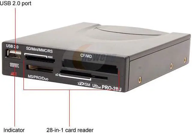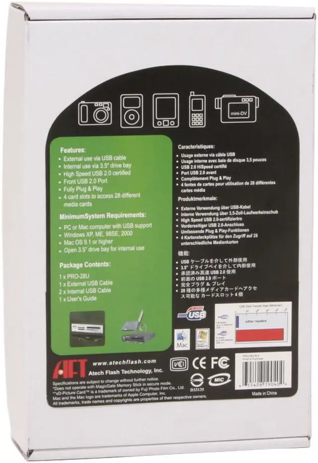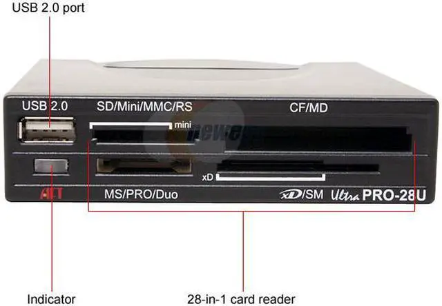 | Features | Internal use installed into 3.5" drive bay Hi-speed USB 2.0 data transferring between flash media cards for Mac/PC, Notebooks, Digital cameras, PDAs, and MP3 players 4 card slots allow you to access 28 media formats Pin-proteced Compact Flash card slot No adapters required for mini-SD, RS-MMC and MS-Duo Supported OS: Mac OS X and later Windows 2000/XP USB 2.0 port |