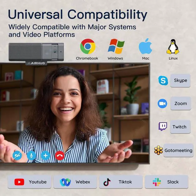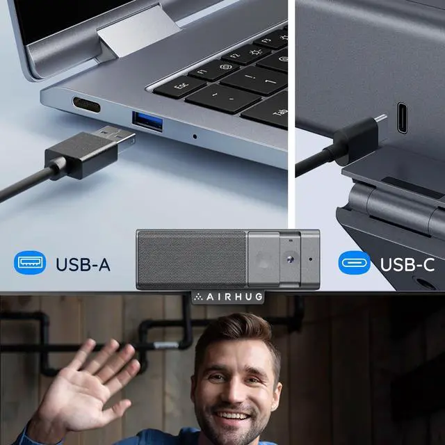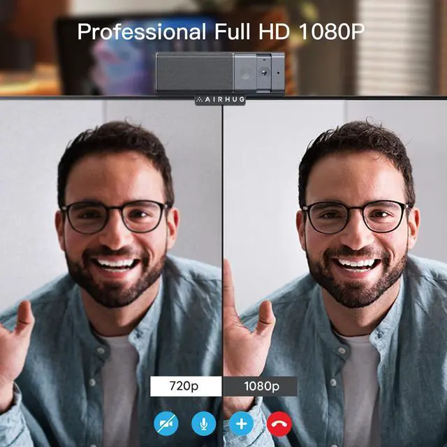 The AIRHUG 16 webcam delivers crystal-clear 1080p video at smooth 30fps, ensuring sharp visuals for every call. Featuring a 2.07MP sensor, automatic white balance, and a 76° field of view with fixed focus, it's perfect for online meetings, video chats, and remote learning. The built-in microphone captures clear voice pickup within 6 feet, while the compact, all-in-one design makes it ideal for work, classes, and streaming on the go.
