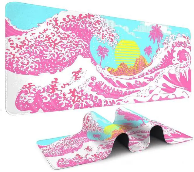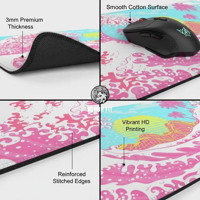 Immerse yourself in a pastel neon dreamscape with the Alpha Fit XXL Gaming Mouse Pad (Pink Vaporwave Edition). This design takes the retro-futuristic aesthetic to a new level, reimagining Hokusais wave in a vibrant palette of hot pinks, cool cyans, and electric yellows. Featuring silhouette palm trees, a digital wireframe mountain, and a glowing retro sun, this pink gaming mouse pad captures the essence of "Miami Vice" nostalgia mixed with Japanese tradition. It is the perfect centerpiece for "Kawaii" setups, synthwave lovers, and anyone who wants a desk that pops with energy.