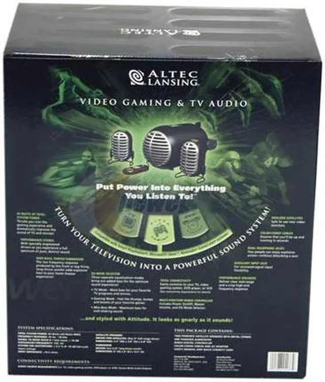Serious Power, Performance Stereo, Deep Bass, Ported Subwoofer, Dual-headphone Jacks, EQ Mode Selector, Multi-function wired controller, Total Connectivity, Auxiliary input jack, Shielded satellites for use near TV sets and video monitors, and color-coded cables for easy installation.