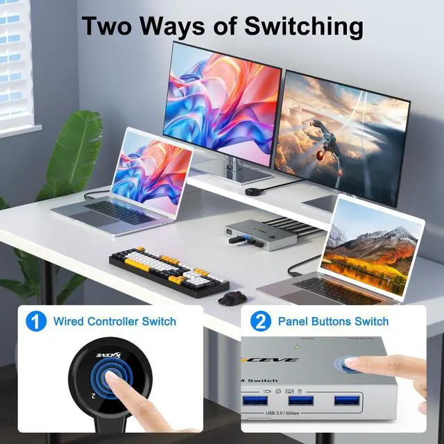 KVM Switch 2 Monitors 2 Laptops USB C,4K@60Hz USB C Dual Monitor KVM Switch for 2 Laptops Share 4 USB 3.0 Devices with 80W PD,Wired Remote and USB C Cables Included