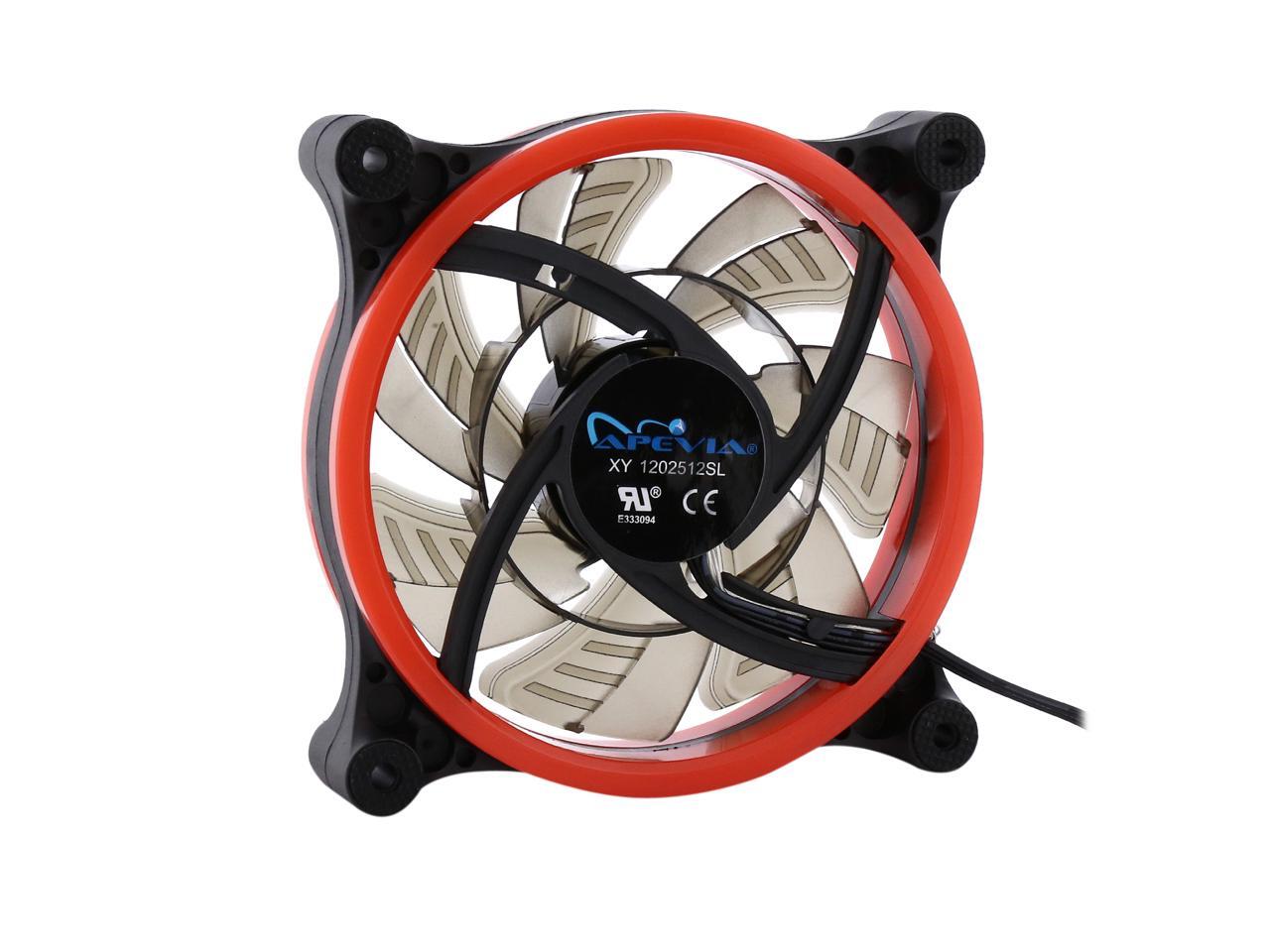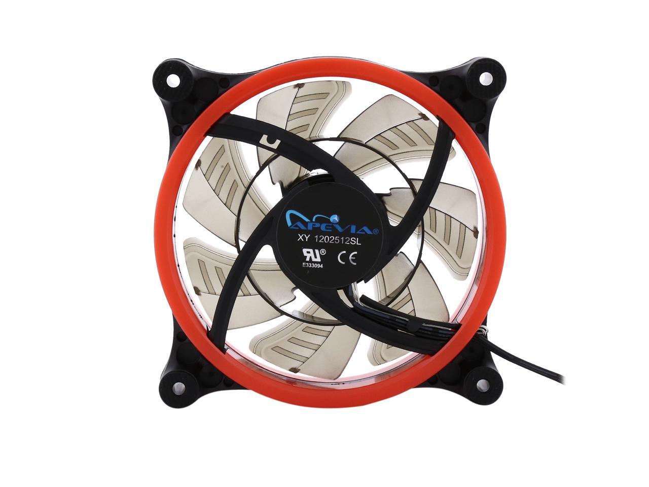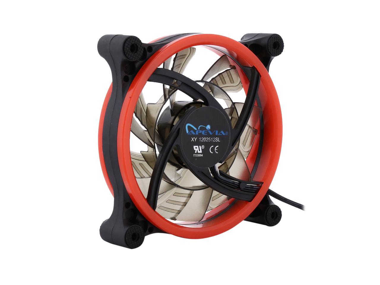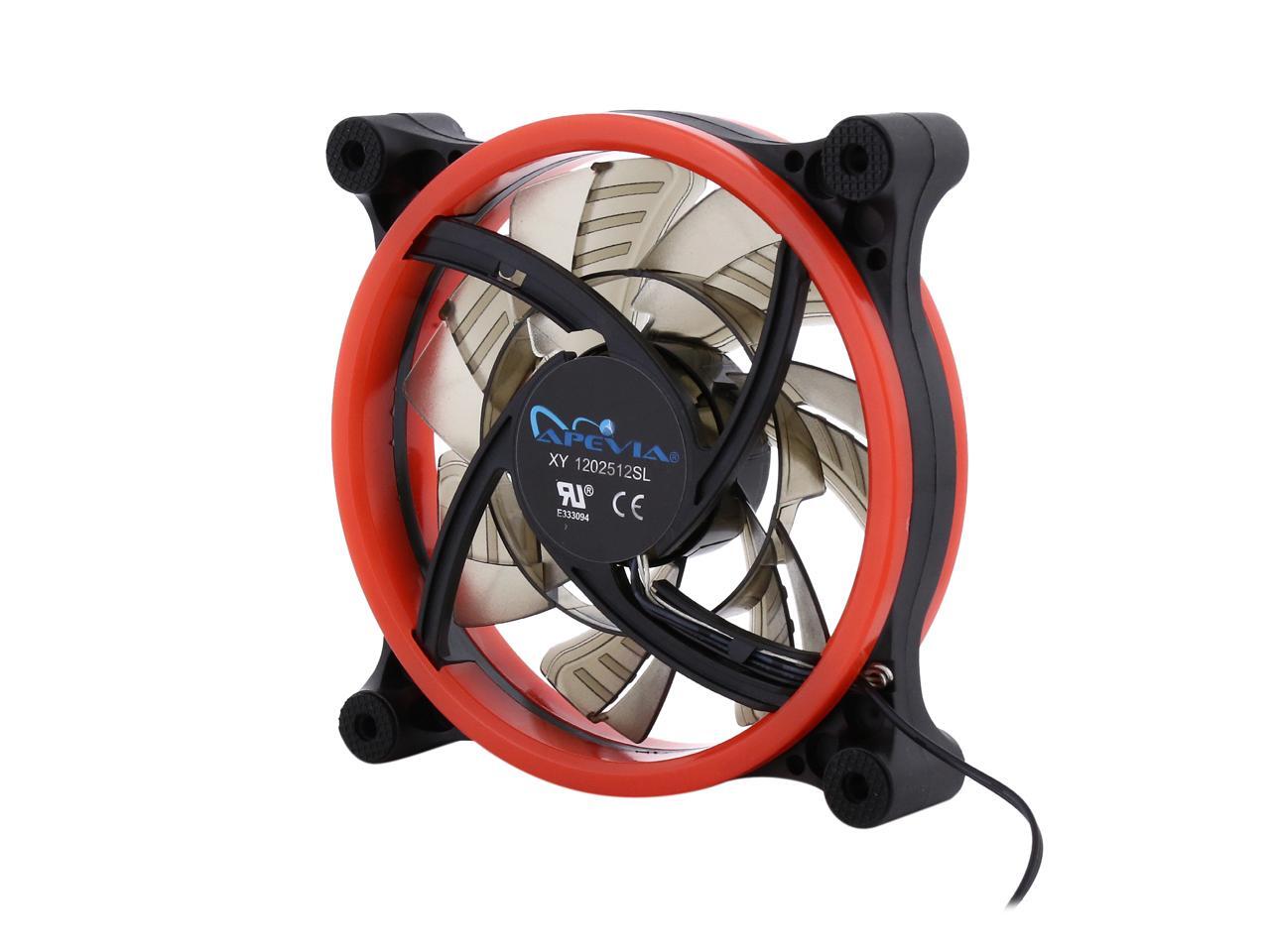 | Features | Apevia 120mm case fan with 32 red led lights (3 pk) Two colored rings for a bright glow 32 leds within the rings give a solid red glow to the fan 7 stylish black blades and black frame Four anti-vibration pads to reduce noise |