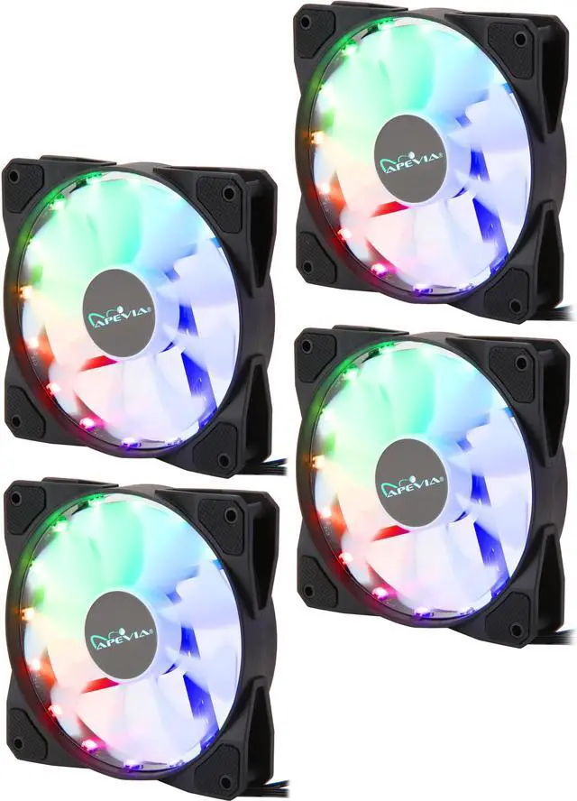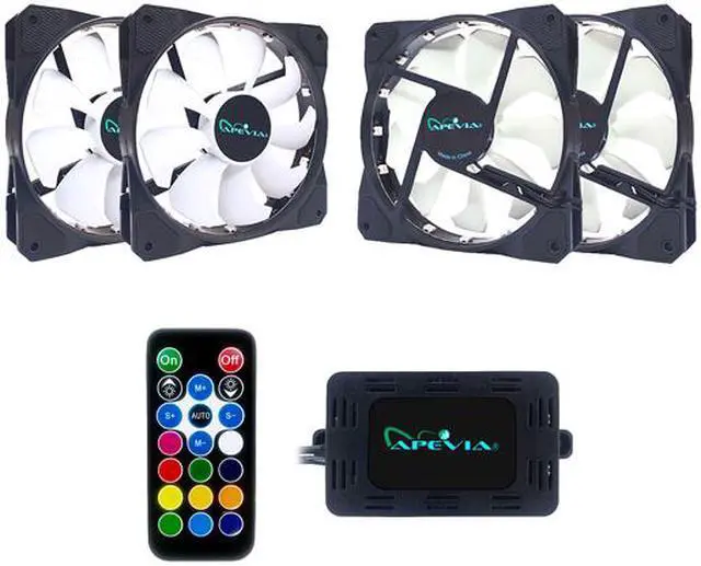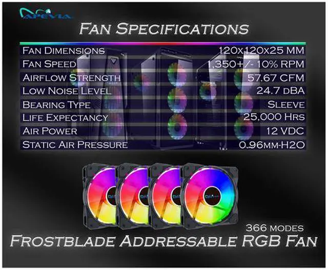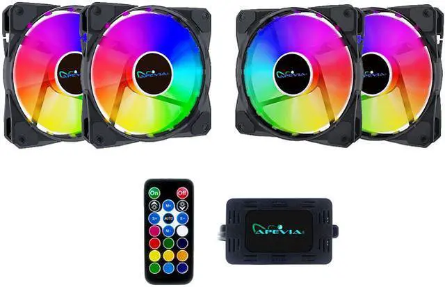 | Features | 120mm x 120mm x 25mm Silent Addressable RGB fans (4 pack with RF remote control) With 16 x Addressable RGB LED Lights & 8x Anti-Vibration Rubber Pads (4 on Each Side) Fan Speed: 1350 +/- 10% RPM Air Flow: 57.67 CFM Noise Level: 24.7 dBA Life Expectancy: 25,000 Hours Supports up to 6 compatible RGB fans and 2 x compatible LED strips Up to 366 selectable modes of color and style combinations Control Box comes with 4-pin connector for connecting to power supply |